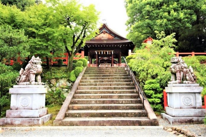 ↓奥の大きい屋根が本殿です 一間社流造と謂れ簡明な意匠で近代本殿の好例とされています 後ろは船岡山山頂です