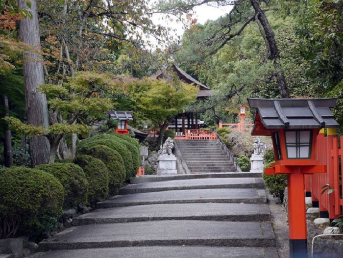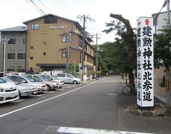 ↓最後に北大路通りに面した北参道です(境内図右一番上です) 少し暗いですが神社へは正面突き当たりの奥から左へ登ります、右へは船岡山に向かいます