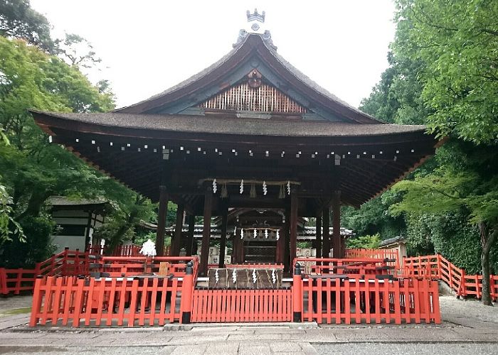 ↓「拝殿」です 檜皮葺きの四方吹放ちの社で軒反りが大きく、優美な外観をしています