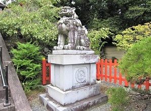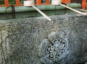 ↓石段手前にある「手水舎」の水盤です 彫られているのは織田家の紋”木瓜紋(モッコウモン)” 右「狛犬・阿像」の下も同じ紋が見られます、一般に織田木瓜と謂われます