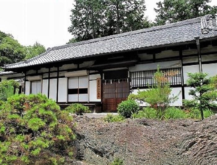 ↓「社務所」 前の露出する岩盤は古代の地層がむき出して鎮座しています 成分がチャートと呼ばれる古岩石で船岡山の各所で見られます