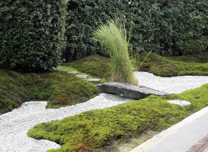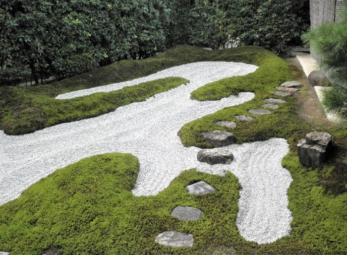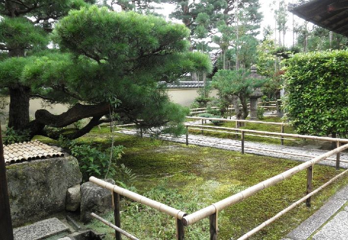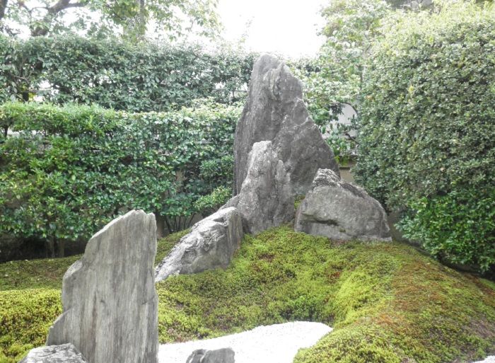 蓬莱山式庭園で。砂紋の荒波を受ける岩礁や苔と丸い刈込みの樹木で顕わす半島が見事に配置され、大海からの絶え間ない荒波に打ち寄せられもまれながらも雄々と独坐している大自然の様子を表現しているとされます