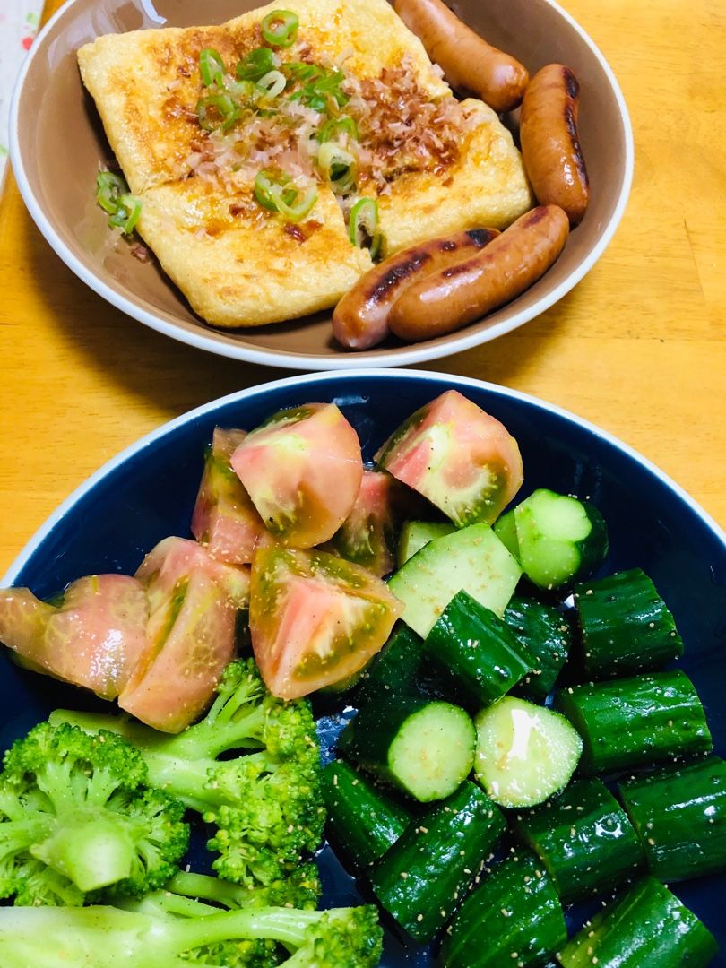 油揚げを焼いたのに、ネギと鰹節ウィンナーきゅうり・トマト・ブロッコリーに塩・胡椒・ごま油とダシ