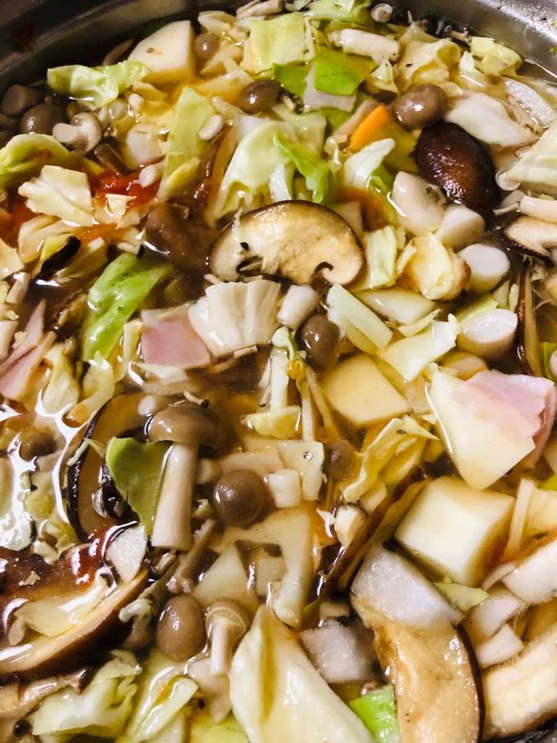 好きな野菜をざくざくと切ってコンソメとニンニクのすりおろし冷凍しておいたトマトを足して煮込んでるところ。セロリがあれば最高ですが、今日は良いセロリが無かったので入ってません。パプリカとか入れても美味しい。今日?しめじ、シイタケ、キャベツ、ジャガイモ、玉ねぎ、ベーコンが入っています。
