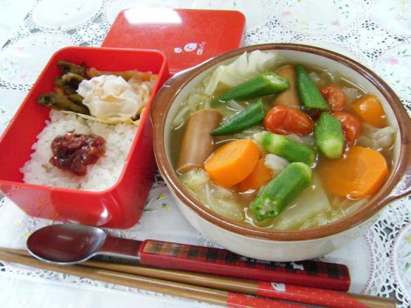♪野菜スープ(キャベツ、人参、玉ネギ、オクラ、ミニトマト、ウインナ、コンソメの素)♪ミニ弁当(梅干ご飯、蟹シュウマイ、ゴーヤのオカカ炒め)ピンチですお盆から食べたいものを食べて幸せな日々を過ごしていました。自室で使っていた体重計が壊れてしまっていて、体重を量っていなかったんです。「なんか、顔が丸くなったなぁ。体も重いみたいだし。。。」昨日、決意してふく母が使っている体重計を借りて久しぶりに体重確認をしました。な。。。なんと~2kgも増えてしまっていましたふくふくは身長が、155cmと余り背が高い方ではありません。この身長で、2kg増はかなりのピンチです。確かに、お盆はふく父が帰ってきてくれて嬉しくってご馳走を作ってパクパク食べましたお盆が終わってからは、毎週週末を使ってお盆に来てくださった親類の家にお礼周りをしていました。ふく父は、10人兄弟。ふく母は8人兄弟なので親類宅がかなり多いんですよネ。お宅、お宅で美味しい食べ物を振舞ってくださって、パクパク食べていました。そして、家に帰ってきて「疲れたねぇ~!でも楽しかったねぇ~」とふく母とビールでお疲れ様会☆う~ん☆これは太っちゃいますよネ!反省デス。今週末も角田のふく母の姉妹のお宅にお礼に行く予定です。ふく母もとっても楽しみにしています。お料理上手な叔母さまなのでご飯も楽しみです(コラコラ☆)。折角、作ってくださっているし~なによりも美味しいから食べるのは我慢できないと思います。だから、せめて平日だけでもダイエット作戦を始めようと決意しました。目標、マイナス2kgです