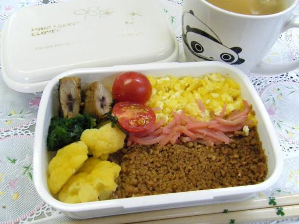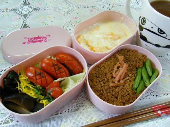 ♪鶏そぼろご飯♪赤いウインナー♪菊のお浸し♪茄子のお漬物♪マンゴーヨーグルト♪レタスとミニトマト♪ワカメの味噌汁寝坊して、時間がなかったので超簡単お弁当です。そぼろご飯も卵を炒める時間を省略して一色のみ気持ち紅生姜とササギをのせましたご近所さんから美味しいマンゴーを頂いたので、ちょっと贅沢にヨーグルトにタップリといれてデザートにしました。あま~くってとっても美味しかったですヨ慌てて作ったお弁当でしたが、お腹いっぱいになって幸せランチでした♪