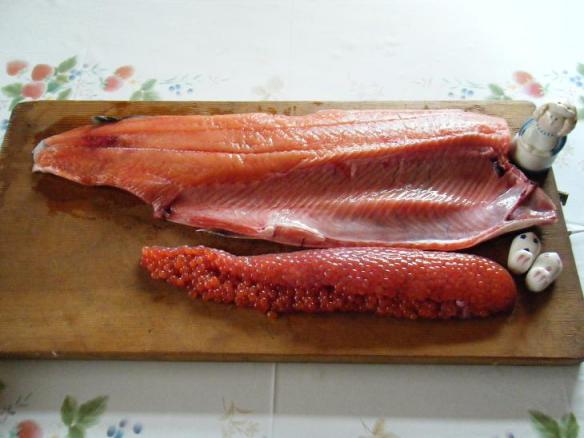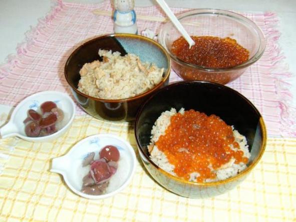 今年、初のはらこ飯です昨日は、朝からテンション上がりまくりのふくふく家の台所。まず、しっかりと味をしみ込ませたいのでイクラ作りです。生のハラコなので、大根を輪切りにしたので皮からパラパラと外します。力をいらなくても簡単に外れていきます。大根を使うことで、ごみや汚れが取れるんですヨ。パラパラに外したハラコを約70度位のお湯の中に入れて、お箸5~6本を使って素早く1~2分位かき混ぜます。ざるでお湯をきって、好みの味に漬け込みます。味付けは、ふく父は生醤油派、ふく母はめんツユ派と好みが分かれていました。今年は、ふく母の好みでめんツユで味付けです♪鮭の身は、醤油、お酒とシンプルな材料で煮汁を作ってさっと煮込みます。この時、アラ(頭や骨の部分)を入れると味が出ておいしいですヨ。今回は、朝市でラッキ-にもアラの部分をおまけでいただいてきたので、有難く使わせてもらいました♪鮭の旨味たっぷりでこれだけでご飯を食べれる美味しさデスこの旨味たっぷりの煮汁で、炊き込みご飯を作ります。ご飯が炊き上がったら、鮭の身をホックリと混ぜ込んで鮭ごはんの出来上がりです。お手製のいくらをたっぷりと、鮭ご飯にのせて、ふくふく家の【はらこ飯】の完成ですまずは、ふく父にお供えです。去年は食べれなくって「悲しいなぁ」って言ってたもんネ。鮭ご飯もイクラもたっぷりと盛ったよ~。お味はどうかなぁ?たまには夢に出てきてねぇ♪感想が聞きたいヨ☆出来立てのホクホクをパクリ♪う~ん!食べたかった【はらこ飯】やっぱりとっても美味しい~先日、キノコ狩りで採れた「網たけ」も大根おろしと一緒に食卓へ☆秋の幸せ晩御飯でした