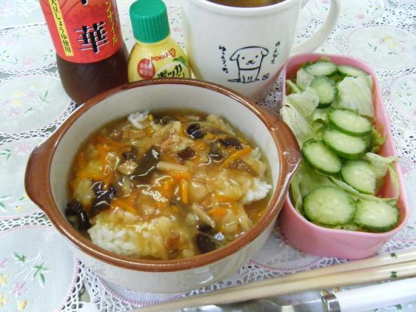 ♪中華丼♪レタスと胡瓜のグリーンサラダ今朝は寝坊してお弁当を作れませんでしたなので近所のローソンでレトルトパックの中華丼の具を買って持参のご飯にかけて簡単中華丼ですトロトロ、熱々でとっても美味しいんです。具も沢山入っているんですよ♪簡単で大好きなメニューです。今日も美味しくいただきました。ご馳走さまでした