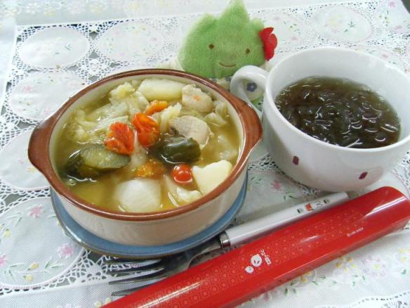 ♪チキン野菜スープ(鶏肉、ジャガイモ、キャベツ、蕪、キュウリ、ミニトマト、コンソメ味)♪季節遅れのトコロテンきっと外は暖かいはずです。綺麗な秋晴れの空が窓から見えます。でも!ふくふくの居る事務所は寒~いですエアコンがまだ冷風なんですよネ。。。暖かいスープがとっても嬉しくです今日は、ジャガイモと蕪をゴロゴロと沢山入れました。胡瓜は、ちょっとしなびていたので仲間入り決定です火を通すととろける様に柔らかくなって美味しいんですヨ。ふくふく家では、夏のお味噌汁の具にもたま~に胡瓜が登場します。「胡瓜のお味噌汁」は、ふく父のアイデアでした。初めて見たときは、「え~っ!」って思ったのですが、これが本当に美味しいんですよ~。ふく父曰く、TVで宮崎の郷土料理の冷汁という料理を見て「これはいけるはず」と思ったと言っていました。懐かしいなぁ。。。季節遅れのところてんもならべてみたのですが、ジャガイモもたっぷり入れたのでスープでお腹いっぱいデス♪美味しくって暖まって幸せ気分ですところてんは、明日のおやつに取っておきます