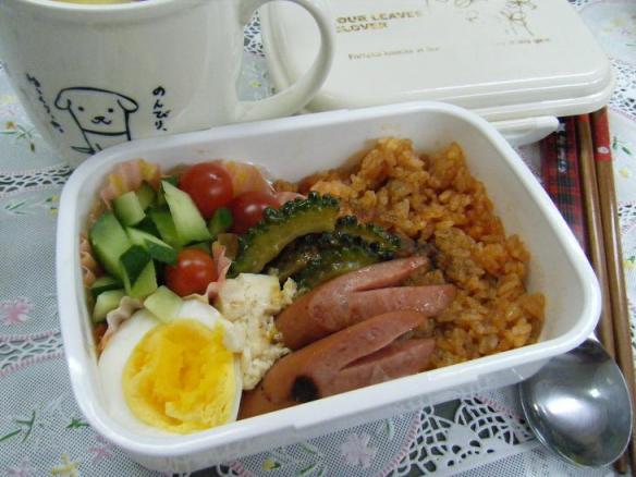 ♪チキンライス♪固ゆで卵♪ゴーヤと豆腐のおかか炒め♪胡瓜とトマトのサラダ♪VVウインナー♪わかめのスープ週の終わりの金曜日。大好きなチキンライスでしめましたケチャップ消費作戦、ちゃくちゃくと進んでいますヨ♪憧れのハインツのケチャップまで後少しです!ななの好きなゴーヤも炒めました。おかかと炒めると苦味がチョッと軽くなります。ななには、おかかをまぜる前におっそわけです。どうもこの苦味が好きなようなんです。この前、塩で洗って苦味を取って炒めてみたのですが、あんまり喜んで食べてくれませんでした今日のゴーヤはシャキとして苦味があったのかしっぽフリフリで大喜びで食べてくれましたそろそろ、ふくふく農園の胡瓜とトマトも収穫が終わりそうです。ちょっと寂しいです。。。しっかりと味わって食べなきゃね