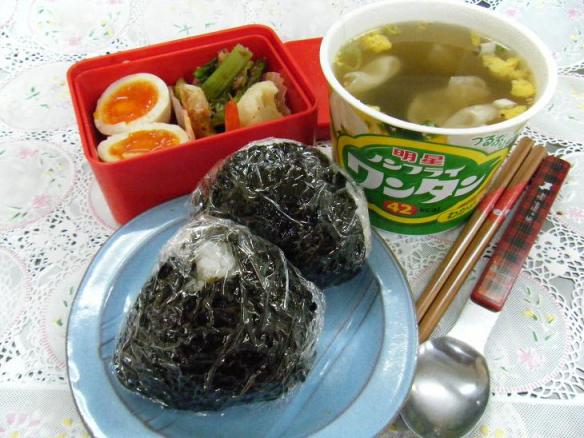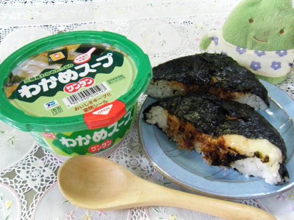 ♪ぺったんおにぎり(チーズオカカ)♪ワンタンスープ朝寝坊をしてしまった時のお助けメニュー「ぺったんおにぎり」です。握ることもなく、1枚の大きな切らない海苔の真ん中にご飯と具をのせて風呂敷を包むようにご飯を海苔で包めば出来上がりの簡単おにぎりです。時間にして1分位で完成します平らで大きめなおにぎりなので食べるときに2つに切ってたべるのがお気に入りです☆具は大好きチーズおかかです。いつもはおかかに粉チーズを混ぜるのですが切らしてしまっていました。でも気分は「チーズおかか」冷蔵庫にあった溶けるチーズを使ってみました。熱々のご飯だったのでチーズがトロ~っととろけました。おかかとの相性もばっちりで、とっても美味しかったです