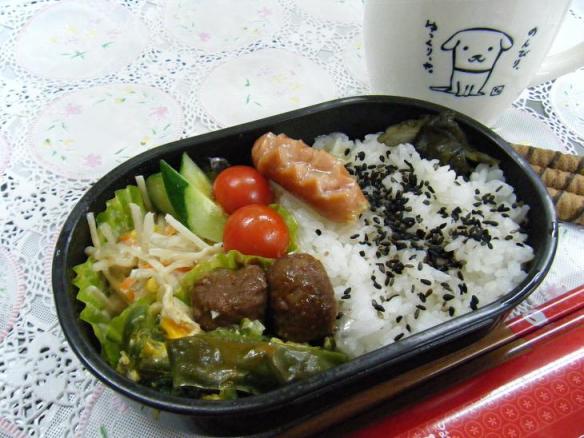 ♪ミートボール♪牛蒡サラダ♪ピーマンの卵とじ♪キュウリとミニトマト♪チーズ入りウインナー♪キュウリのキュウチャン♪ご飯・ゴマ塩ふくふくの会社は9月が決算月なので、今日から新しい期になりますご飯とミートボールって合いますよね♪大好きなお弁当です。お腹の調子を整えたくって、食物繊維タップリの牛蒡のサラダも入れました。なんて、昨日の晩御飯のお残りなんですけどね~歯ごたえがあって、しっかりと噛みしめて食べるので少しは、プクプク顔が引き締まるかなぁなんてちょっと期待しています。エヘヘ♪多めに作ったので今夜も牛蒡のサラダを食べようと思います