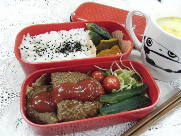 ♪ハンバーグ♪キュウリとレタスとトマトのサラダ♪カボチャの煮物♪胡瓜の漬物♪ゴマ塩ご飯やっと週末です昨日の台風がうそのように穏やかな太陽が輝いています。週末も天気が良いといいなぁ♪冷凍庫を除いたら、前に作って冷凍していたハンバーグがありました。そろそろ食べないと悪くなってしましそう。。。今日は、大好きなハンバーグ弁当に決定ですケチャップ消費大作戦、着実に進んでいます。会社のケチャップはまだまだ沢山あるのですが、ふくふく家のケチャップは後少しで使い終わります。憧れのハインツのケチャップまでもうすぐです☆楽しみだなぁ
