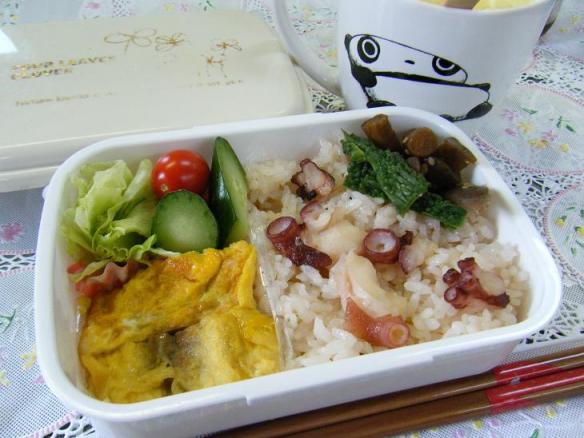 ♪タコご飯♪卵焼き♪野菜サラダ(レタス、キュウリ、トマト)♪ゴーヤの塩漬け♪牛蒡とコンニャクの煮物朝市で買ったタコで、ふく母がタコご飯を作ってくれましたほんのりとピンク色のとっても美味しいご飯なんですヨ。生のタコの足でそのままお刺身でも食べました。吸盤がコリコリしてちょっとグロイ表現なのですが口の中で吸盤が吸い付いてくるような新鮮さでした大きな足を5本も買ってきたので、食べ切れなかった分は茹タコにして冷凍しておきました。ちょっとずつ解凍して、食べるのが楽しみです