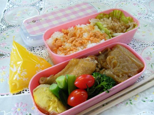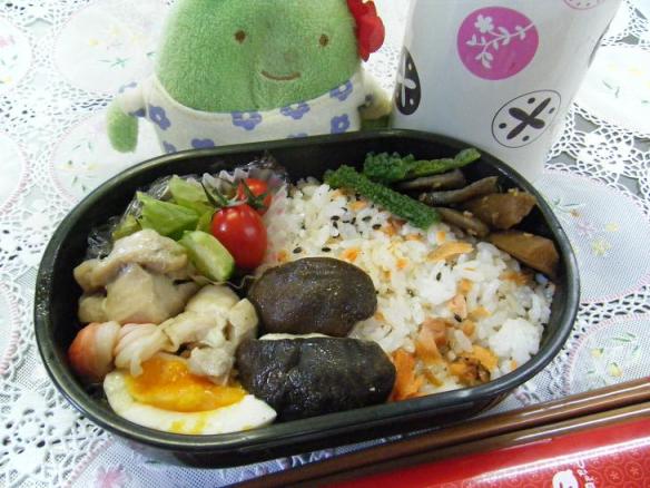 ♪煮物(鶏肉、大根、糸コン、牛蒡)♪ゆで卵♪鮭ご飯♪アスパラとミニトマトとブロッコリー♪もやしもお浸し(かつおぶしのせ)今日は、ふく母作の煮物がメインのお弁当です詰めてみると、なんか全体的に茶色ぽ~いなのでご飯の上にパラパラと鮭をのせてみました鮭って味も美味しいし色も綺麗なので大好きなんです♪ふくふく家の大切な常備食です☆和食なお昼ごはん、暖かい日本茶と一緒に食べました。おやつのじゃがチーズは同僚sさんからのおっそわけです。sさん、ありがとうとってもほっとしたお昼休みで幸せいっぱいでした