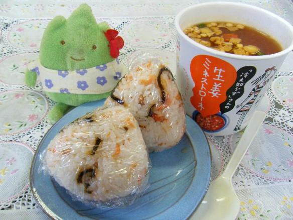 ♪鮭と塩こんぶのおにぎり♪スープ今日は、会社の健康診断がありました。ふくふくは採血が大の苦手なので、数日前からちょっと暗くなっていたんですヨでも自分の体の為に大切な検診なんですよね健康診断の前日は、夜の8時までに夕食を済ませてくださいねとの事でした。ところが!昨日は夕方からバタバタしていて気づいたら夜の8時を過ぎてしまっていました。「ちょっと位、いいかなぁ」と悪魔のふくふくは囁いたのですが。。。そこはぐっと我慢して、夕飯抜きでした。朝は、お腹がペコペコ~☆お昼に食べるお弁当の事で頭がいっぱい状態ですとっても悩んだんで決めたのが「大きなおにぎり」熱々の炊き立てのご飯をキュキュと握りました無事(?)検診を終わって食べたおにぎりは格別に美味しかったです。しみじみ、お米ってえらいなぁと思いました