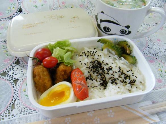 ♪唐揚げ♪ゆで卵♪赤いウインナー♪レタスとミニトマト♪ゴーヤの塩漬け♪ごま塩ご飯ふく母がゆで卵を沢山茹でてくれました半熟のトロトロです。ふくふくは固ゆでが好きなのですが、ふく母は半熟好きデス。固ゆで卵を茹でようと思うのですが、いつもふく母のスピードに負けてしまいますなくなりそうになると、すぐ茹でてくれるんですよねぇ。半熟卵=母の味で~す☆今日も有難くお弁当に使わせてもらいました。レンジでチンしても半熟のままなので、ちょっとお行儀が悪いかもなのですが唐揚げに絡めて食べるととっても美味しいんですヨ今年は後半にゴーヤが沢山採れたので塩漬けにしておきました。日持ちがするので、これからもゴーヤが楽しめそうです
