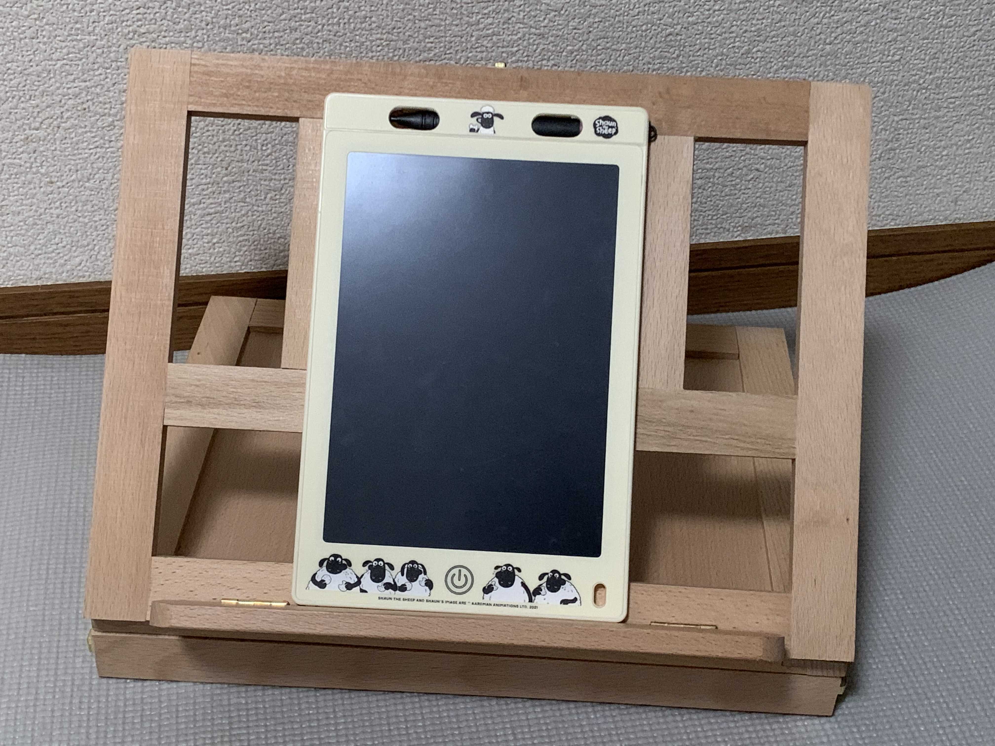 立て掛けた状態がこちら、電子メモパッドを置いてみました。絵を飾ってない時はこんな使い方もできます↓