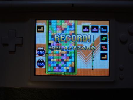 父娘が「花男」にハマる中、妻は一心不乱にDSをやっている。実は、DSのテトリスで『レベル60までいったよ!』と友達に話していたところ「息子がレベル147を達成しました!」というメールを受け取ったようだ。それから妻は ひたすら修行の道へ (ToT)/~~~。 DS猿だった娘があきれかえるほど、DS漬けの妻。なかなか「100」の壁が越えられないとぼやいていたら娘が 簡単に「レベル107」をマーク!! そこから 妻の負けじ魂に火が・・・・・ 苦行の末に出しました。 『レベル165』 一言、言わせてもらえば 何時間かかったんだ!!!