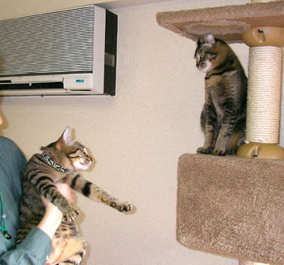 引き続きcocoyamuyamuさん宅にてそのネコ悟空とのご対面である。すでに戦いのゴングは鳴っておりBGMは布袋寅泰『キル・ビル』のテーマといった感じ。↓姪太郎!頼むから、仲良くしてくれよ!悟空「てめぇシッポのばせよ」姪太郎「何だと!オマエもミミ伸ばせよ!」↓すごい!ゴミ箱もネコ型だな!ゴミ箱「…」姪太郎「むかつくやつが居るんだよ加勢してくれない?」 悟空「オマエのかあちゃんしっぽウズぅ~」姪太郎「オマエのかあちゃんミミ折れぇ~!」↓ようし!お利口なほうにおやつあげるぞ悟空「ボクに決まってる!」姪太郎「お利口?ボクだよ!」↓お利口じゃないけどあげるよ!full「馬肉うまいだろ?」姪太郎「うまい!ミミ折れにはやらん!」↓危ないから悟空はケージに入ってもらったぞ!悟空「し、しまった!」姪太郎「袋のねずみだな!」さあどうなってしまのかわからないが、仲良くなれる気配のない二匹。見た目は似てるんだからちょっとぐらい歩み寄ってもいいんじゃないか、姪太郎!悟空側からのレポートはコチラさらに明日につづく・・・。↑日々クリックで日々投票お願いします↑ランキングページはこちら。