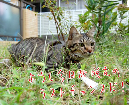 引越し先の家に「庭」がないことを、パンダから教えてもらっていた姪太郎は、庭に出してもらっていたときに、最後の脱走のチャンスとばかりに隙をうかがっていたのだった。姪太郎 「よし、これが最後だと思って」姪太郎 「よし、幸いだれもきてないぞ」姪太郎 「さあ!いまだ!」姪太郎 「うぐっっっ!」姪太郎 「てな感じだったよ」パンダ 「ミッションインポッシブルだな」最後の脱走のチャンスを逃した姪太郎。引越しは今度の土日だけど、なにやらパンダと一緒に悪巧みしすぎなんじゃないか、姪太郎!↓コチラにても公開中です!