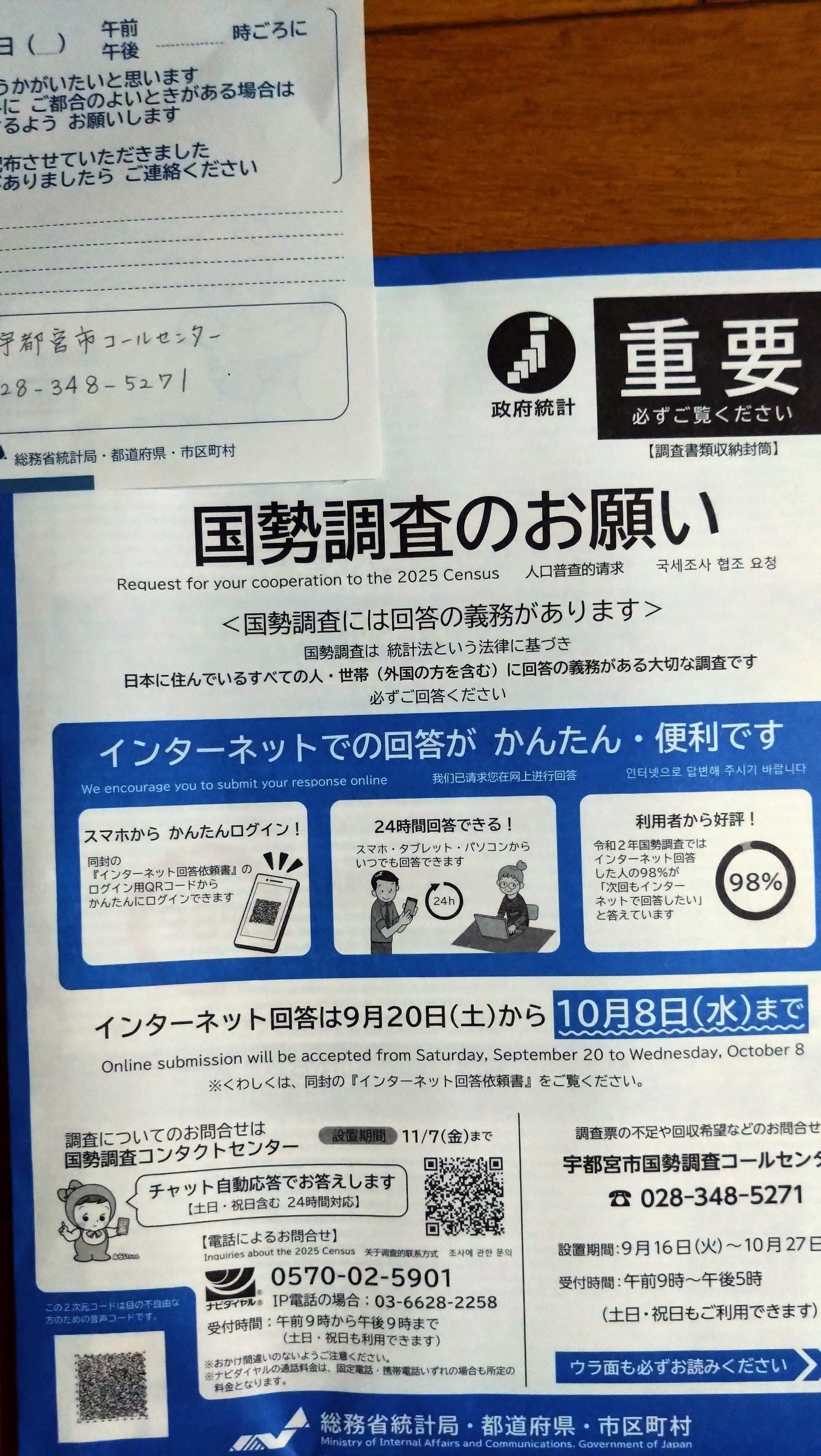 5年に一度の国勢調査5年もすると取り巻く環境も変わっていないようでやっぱり変わっているものですねダンナさんが亡くなって下の息子が婚姻して家族が増えた自分のカラダも変化体重を増やさないように気をつけるのはタイヘンです(;^_^Aともかく元気でいられるのはありがたいことです次の5年後仕事をやめて、何をしているやら病気で死んでいるかもしれないし…元気で遊びほうけているかもしれないし…また、同じことを考えながら国勢調査してるかな