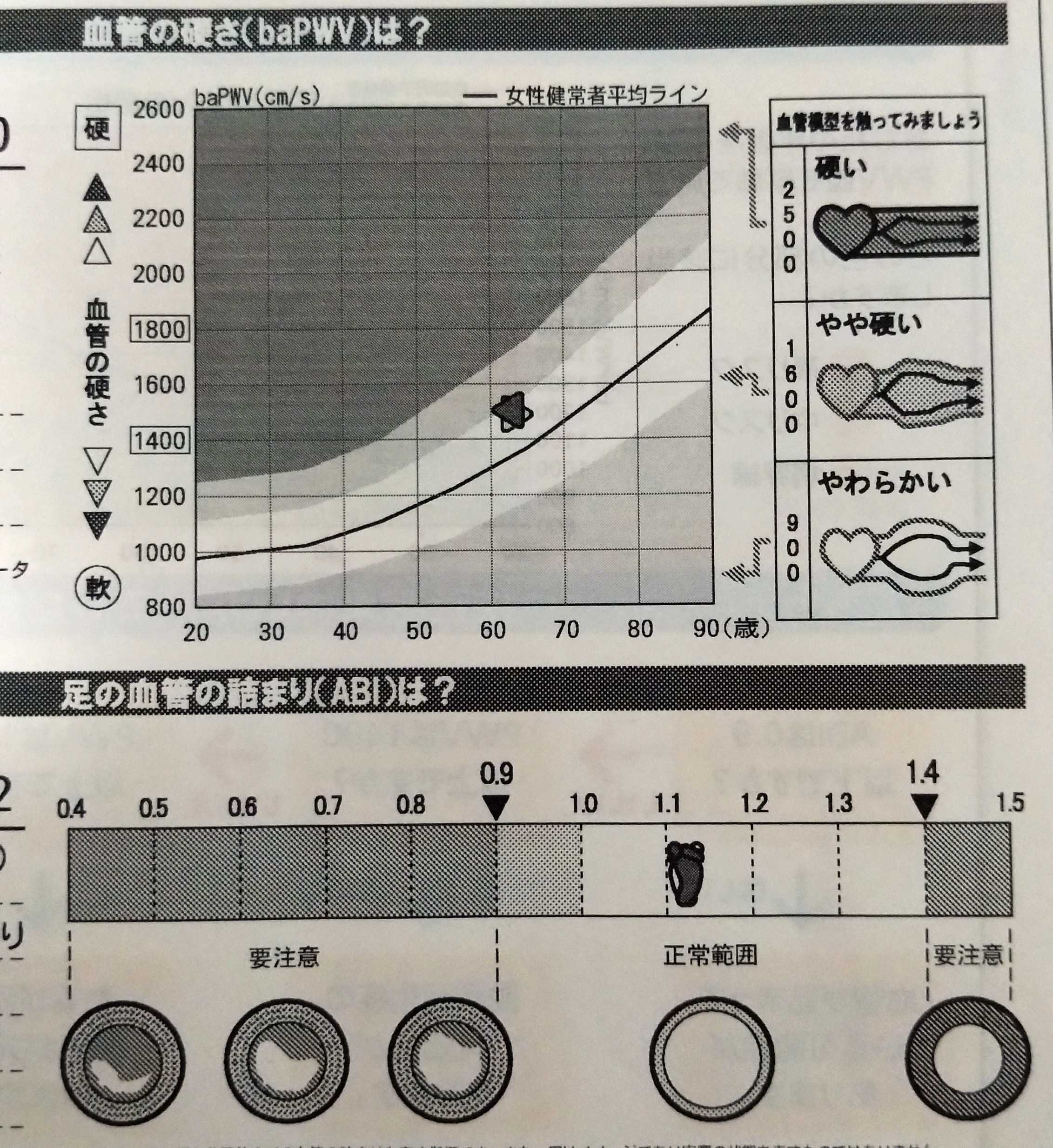 先月の健康診断の時に動脈硬化のオプション検査をしましたその検査の結果がきました手足の血圧を測って血管の硬さと足の血管の詰まり具合みる検査血管の硬さ(baPWV)は実年齢相応足の血管の詰まり(ABI)は正常範囲とりあえずは、平均ライン幅には入っていますが血管がやや硬くなっているので安心できる数値ではないようです簡単な検査ですし、検査料も¥3000ほど定期的に検査を受けるようにしようと思います