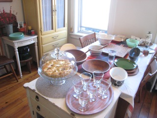 今年は、職場のみんなを招いてのサンクスギビングでした。お店を始めてから初めてのホームパーティーだったかも?なんだか部屋もついつい散らかってきてたからこういう機会でもないと、大掃除とかできなかったし、お陰で部屋も片付いちゃってよかった♪どの料理をどの器に盛ろうかな。。。とか考えながら、テーブルセッティングを決めるのがまた楽しいのよね~。取り皿はファイヤーキングにしてみました。川津幸子さんの本『そろそろ大人のおいしい暮らし』を見て、どうしても食べたくなったブランダードという料理に初挑戦。ジャガイモを蒸してマッシュポテトにしたものと、干し鱈をつかったグラタンのような料理干し鱈は水につけて塩気をとり、牛乳と水で煮ます。生クリームと牛乳を加え、にんにくもたっぷり入れ、最後にパン粉をかけてオーブンで焼いてできあがり。パン粉のサクサク感と、中身のしっとり感が絶妙!今回の料理で、これが一番人気だったかも!スイートマッシュポテトインゲンのガーリックソテーはしんなりなりすぎないよう、歯ごたえを残して私の大好きな、カリフラワーのロースト。シンプルだけど、野菜の甘みが引き立ちます友達が作ってきてくれた、ビーツサラダはオーブンで4時間焼いた力作牛のたたきサラダは、しょうゆ、ゆず、にんにくの風味を効かせて。。。友達作、スイートポテトのタルト友達作、とりの唐揚げそして今回のメイン!実は今年はターキーの丸焼きは作らなかったんです。というのも、サンクスギビング前に料理番組を観ていたら、かなり美味しそうなターキーの胸肉を使ったレシピを紹介していたので、今年はそれを作ることに。。。胸肉を薄く叩きのばし、中にジャックチーズ、ブリーチーズ、ハム、ホウレン草を入れて巻き込みフライパンでこんがり焼き色をつけてからオーブンへ。リクエストに応えて、アップルパイも焼きました。最近買ったばかりの、70年代のイングランド製のティーポットでお茶をお出ししました。 最後は食器を全部洗ってから乾かして。。。。。。ごちそうさまでした♪