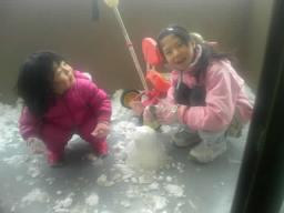 今日は旦那が仕事なので、娘二人でベランダで雪遊び中です…
