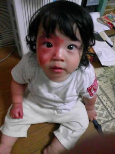 あいあい、無事に1歳になりました~!!思えば陣痛始まってから4時間ほどの超スピード出産でやってきたあいあい。常に太目ちゃんながら、大きな怪我も病気もせずに、すくすくと育ってくれました。甘えん坊のお姉ちゃんがいてママやパパを取られる(?)こともしばしばだし、生後7ヶ月からは保育園にも入り、さびしい思いもしているだろうに、毎日一生懸命生きています。お誕生日当日は私も仕事でご馳走を作ったりはできないし、一升餅の手配も間に合わなかったので(実はすいかが児童会館でトラブルを起こしていて、最近は指導員の先生と話すことも多くて、自宅に帰ってからは何かする気分にもなれずにいたので・・。)写真館の写真撮影にあわせて、日曜日にまとめてお祝いすることにしました。ちなみに、1歳になったあいあいの近況はこんな感じ↓びっくりした方ごめんなさい。目の周りの赤いのは口紅です。私のかばんから落ちていた口紅を、あいあいがいつの間にか拾って~。蓋開けて~。回して~。手でつかんで~。あちらこちら塗って~・・という感じだと思います。一応口を見てみたんですが、食べた形跡はないものの、歯に赤いものが・・?口紅なので、口に入って困るものは使っていないだろう、ということで様子を見ています。こんな感じで毎日いたずらざんまいです・・・。