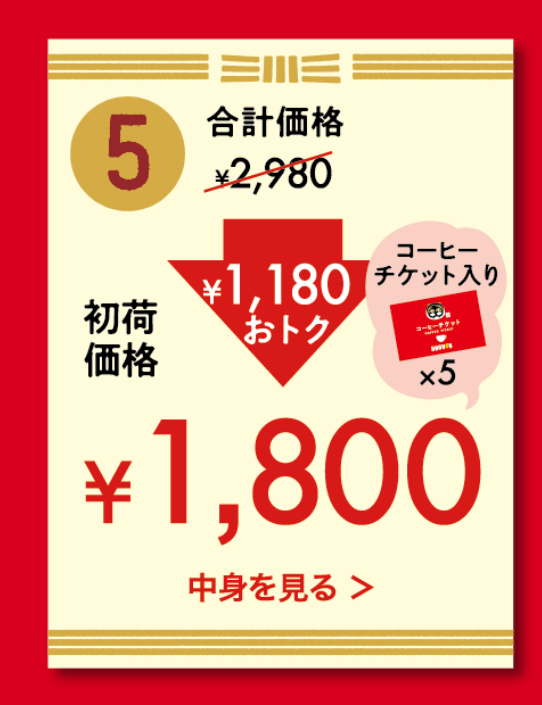 ドトールではMOZとコラボした可愛いグッズが付いてくる福袋もあったのですが予算の関係で安くてコスパの高いこちらのコーヒー豆セットを購入しました。MOZはヘラジカでお馴染みの↑みたいなロゴ。なんと商品価格1800円で1180円もお得というじゃないですか!?それが本当なのかも確認していきますよ。袋は表面が金裏面が白色で側面が赤色と非常におめでたいカラーリングで非常に特別感があります。干支の寅のデザインも今っぽいスタイリッシュな感じで良いですね。中身は非常にシンプルです。コーヒー豆×2とコーヒーチケット×5が入っています。豆は店員さんに挽いてもらうことも出来ますが我が家ではシロカを使っているのでそのまま購入しました。こちらの豆の賞味期限は6月19日までとなっていました。siroca 全自動コーヒーメーカー SC-A211 全自動コーヒーメーカー オートコーヒーメーカー 挽きたてコーヒー 粉【送料無料】公式サイトを確認したところこちらのコーヒー豆の価格は870円でした。お次はこちらのドミニカンブレンド2022です。賞味期限は6月9日まででした。原生林の中に佇むドミニカ共和国シルベストレ農園で大切に育てられたティピカ種を中心にドトールのブレンディング技術により調和の取れた味わいに仕上げたそうです。チェリーのようにほのかに香る、フルーティーな余韻を楽しめるそうですがコーヒーバカ舌な私にとってその余韻を楽しめるかどうか気になるところです。コロンブスの終の棲家ドミニカ共和国 [ 田中みきお ]価格は990円でした。ちょくちょく業務スーパーでもコーヒー豆を購入している私にとってはかなりラグジュアリーな豆に感じますね!(業務スーパーは倍の400グラムで400円ちょっと)きっと業務スーパーの倍美味しいことでしょう!最後にコーヒーチケットですがこちらは大きめなぽち袋みたいなものに入ってしました。ドドールのコーヒーチケットはカードサイズのペラ紙でした。↑2021年スターバックス福袋を開封だ!の記事より。コーヒーショップとしての方向性も国(ドトールは日本企業、スタバはアメリカの企業)も違うので比べるものではないですが2021年のスターバックスの福袋を購入した時についていたコーヒーチケットは見た目にも非常にラグジュアリーなものでした。残念ながら2022年のスターバックス福袋は抽選で落選してしまいました残念…!こちらのチケット1枚でブレンドコーヒー、アメリカンコーヒー、アイスコーヒーのSサイズもしくはRサイズいずれか1杯と引き換えることが出来ます。それぞれの価格は以下のようになっています。Rサイズなんてないんですけど!?どういうことだよ一体…。Mサイズは一応Rサイズと考えて良いのだろうか。引き換え対象のコーヒーはどれも同じ価格なので損得は無いので分かりやすいですね。しかしドトールのコーヒーは安いですよね。駅近でもよく店舗がありますしこの価格では気軽に立ち寄れますよね。それでは福袋が出揃ったので全ての価格を合計してみます。コーヒーチケット選択候補の中では1番値段が高いMサイズの店内飲食で計算します。870+990+(275×5)=32353235-1800=1435あれ!?1435円!?公式サイトでは1180円お得と謳っているからかなり乖離があるぞ…。もしやコーヒーチケットの引き換え対象はSサイズか!?Sサイズの店内飲食価格(224円)で計算。870+990+(224×5)=2980ここから購入価格(1800円)を引くと…2980-1800=1180!(公式と一致)コーヒーチケットは実質Sサイズ引き換えだったわ。ならば一体Rサイズってなんだよ!?・・・・・。妻が色々調べてくれたのですが2015年7月の食べログにドトールコーヒーショップの難波店にはSサイズがなく、Mサイズ相当のサイズから販売しているとの情報が書かれていました。(現在は不明。)Rサイズを販売しているドトールの店舗では1435円相当お得にコーヒーチケットを利用できるので自分の利用する店舗でRサイズが販売されているかチェックしてみるとよいと思います。色々と勉強になる福袋でした!ドトールの福袋はどれもお得なので皆さまも是非購入してみてくださいね。なお、ドトールの福袋をバリューカードで購入すると運だめしくじが引けます。その際レシートの写真撮影が必要になりますので捨てないように注意が必要です。私はハズレ同然の50ポイント付与が当たりました。バリューカードで支払う際dポイントカードを提示したのですがバリューカードで支払った際はdポイントが貯まらないと言われたのでバリューと言う割になんだか少し残念だと思いました。でもそんなドトールが大好きです!ガンバレドトール!LOVEドトール!Twitter↑風流先生おすすめ商品掲載中(4種から2箱選べる)ドトールコーヒー ドリップパック 100p×2箱セット 送料無料楽天で購入ドトールコーヒー ドリップコーヒー オリジナルブレンド 100袋楽天で購入※あす楽対応【数量限定特価】ドトールコーヒー ドトールブラックコーヒー 260gボトル缶 24本入 (BLACK 無糖 ボトル缶コーヒー)楽天で購入カップスリーブ スタンドコーヒ