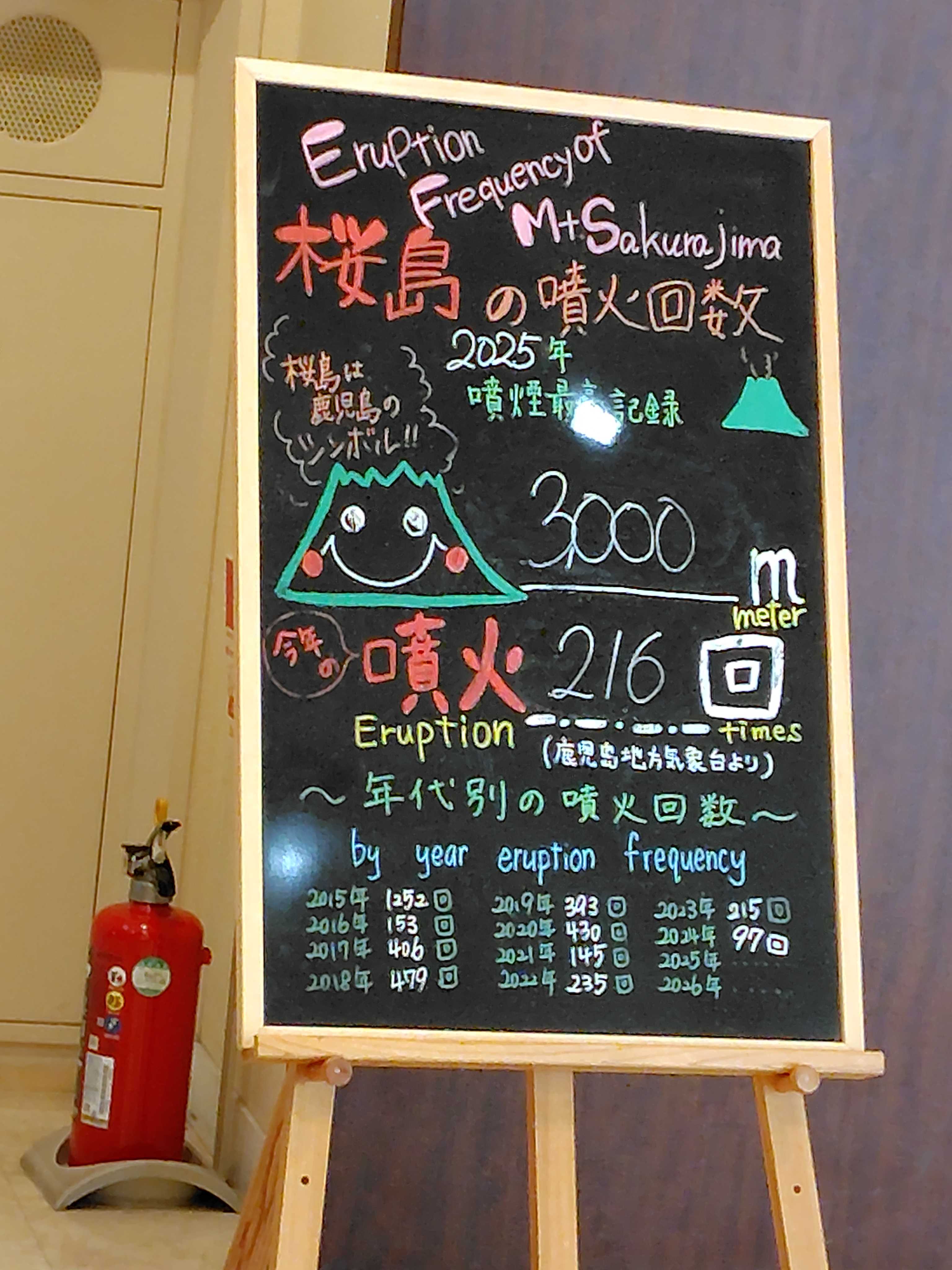 ホテルの黒板には今年の桜島の噴火回数や