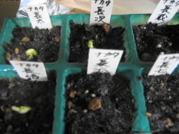 4月中旬の暖かさまで跳ね上がったらしい風々堂近郊。そのせいか、ナカタさん御一同さま(←節成中長にがうり)のトップ争い、ますます激化中。 ちなみにナカタ一門の争い前出記事はこちら→発芽ラッシュなナカタ一家!言い争っていたのはわずか一日前だったのに。先ほど、朝出していたナカタさん御一同さまをば室内へナイナイしたら、 勝者が決した模様です。やはり、長次、頭が土に挟まってます。しかも、ダークホースだった長悟に負けそう(^_^;長司、長六も姿を見せ、長八くんも本日ポットへ移動。発芽第一弾隊、ますます順調! あ。関係ないけど、この記事のタイトル、打っていたらうっかり、『頭、もっこりv』ってなり、慌てて訂正したです。あぶなかった…(こそり)