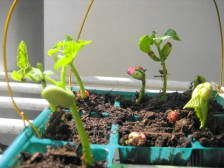 意地悪なお月さまにより、本日の予定を台無しにされながらも、一日遅れで園芸店へ行ってきたくもです。 が、しかーし!肝心の土を買い忘れた、という(爆)や~、ついついあっちこっち眺めているウチに忘れちゃうんですね~v はっはっはっは~っ( ´-`)ノ そんなくもを恨みがましく見上げるモノが… 12日種蒔きのつるなしモロッコ菜豆さんでございます。豆さんなだけありまして、発芽力がすごくて、すでに根っこは凄いことになりかけております。このまんま直植えって手もあるんですが、豆さんです。豆さんは鳥さんにやられやすいんですね。なのでポットトレーに移し替え、やはり本葉が出てから植えるが吉。 そうそう、モロッコ菜豆ですが、こんな子になります。 これは去年6月の画像でございます。サヤごと煮物にv美味しゅうございますよ~~ヽ(*^。^*)ノ 去年はにがうり達の前面に12株ほど植えまして。にがうりさんがモンスタージャングル化する前に収穫を終え、大成功でございました。今年のタネさんも去年の残りさんたち。豆科のタネ保存率ってやっぱり高いんでしょうかね~?去年と大差なく、サクッと発芽しちゃいましたから。今年も美味しく収穫できればええな♪ でも、その前に育苗用の土、買ってこなきゃですが(^_^;