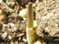 風々堂近郊、雲多くあるも、ただいま晴れ。 お早うございまする。昨夜早めに爆睡こいたおかげか、ちょっぴり体調持ち直したらしいくもでございまする。でも、これからゴハンをかっ喰らい、直ぐに外出予定。ちょいお出かけしなければ。すでにオカンがカートを持ち出し、スタン張っております。たいそう忙しくなる予感……(^_^; でもその前にこちらを。 日曜日にパチリした新芽でございまする。2月に誘惑に負けて仕入れ、11日日曜に植え付けました。タネではなく、苗。しかも根っこだけ苗の形で398円、10株也。初年度二年度までは収穫数少なく、しかして3年目から多収が望めるとゆーvやや加湿を好み、真夏は極力直射日光をさけるべし。くもはこれ、夏場は欠かせません。喰らいすぎると物忘れが(笑) さあ、見た目、ちょい、爪引っ込まない系ナマモノが興奮すると下腹部ににょきっと生えるモノによく似ていますがっ(爆)なんせ、くも。悪ガキ時代からご近所の爪引っ込まない系に愛されまくってましたから、その状態よく見かけたんですねえ( ´-`)ノそれはともかく。───この子はな~に?ま、菜園主義者にとっては比較的初級クイズでございまするね~v こんどこそ完成予定の、夜図工アップ時に解答をば。 すいません、急いでますので、レスは帰宅後に。皆様、お見舞い多謝でございます(-人-)痛み止め装備で、張り切ってお出かけします!