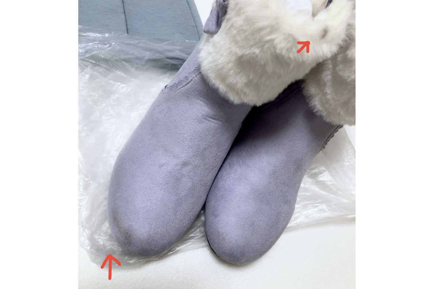 でも帰ってきてよく見ると、ファーやつま先、かかとが結構汚れていました。(なぜか片足だけ…)