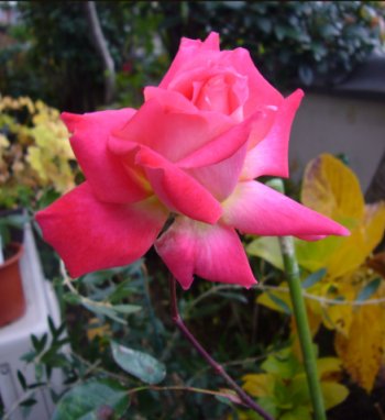 「鞍馬」と言います。昨年、春に京阪さんのとこのローズフェスタで一目ぼれで買ったバラなんです。剣弁高芯咲きがすばらしく美しく、葉は濃い緑で照りがあります。色は、表が輝くような赤のようなピンクのような色で裏は白っぽい色です。