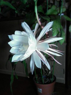 今、月下美人が咲いています。今年3度目の花です。花は一つしか咲いてくれなかったけど、その分、大輪です♪花を寝室に持って行って寝たいけど、ちょっと無理なんで(^^;)玄関でいっぱい眺めて香水の香りを楽しんでお別れしてきました。ホトトギス、昨年購入しちゃいました。藤娘っていう品種です。たぶん、台湾系かと。昨年小さかったのに、すごく大きくなって花もいっぱい咲いてくれて嬉しかったです。丈夫そうな品種だわ。。。趣味の園芸で紹介されてた、キイロジョウロホトトギスとか、日本のホトトギスも素敵ですねえ。持っていませんが、大文字草も素敵ですよね。ユキノシタに似てるけど、鮮やかだし、秋に咲くのが良いです。今度、花屋へ行って気に入ったのがあったら買ってしまうかも(^^;)ゞ****************月曜日の関西系の番組、ちちんぷいぷいで、角さんが月下美人のお話をされていて「おっ」と思ってしまった。でも、なんか画像が咲きかけとしおれかけだけ?ナゼ??しかも、虫が受粉するとかなんとか・・・。月下美人って実の付くやつと付かないのとあるのではなかったっけ???しかもクジャクサボテンの仲間だっけ?ちょっと今、本がないんで明日、調べてみよう・・・