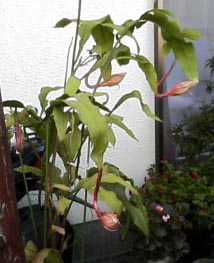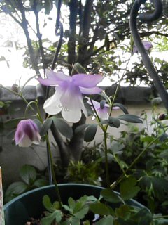 昨年、ブィーさん様から頂いた、オダマキ・グリーンアップルが綺麗に咲いています。前に貰った時は、ちゃんと育てられるか不安でしたが、いろいろ教えてもらって、鉢増しもしてかなりりっぱに育ちました。咲いてみたら、豪華な花束みたく、すてき!感動です♪たぶん、クレマチス咲きって言うのでしょうが、まるでスイレンのような花じゃないですか?可憐で和にも洋にも合う感じがします。母も大変、気に入っておりましたよ。ブィーさん、ありがとうございました♪オダマキ栽培に自信が付いた?かどうかはともかく、楽しくなって、花屋で違うオダマキも購入して今、育てています。一つは、西洋オダマキ・ウインキーの赤と紫。も一つは、風鈴おだまき。画像は風鈴おだまきです。小さくて、山野草みたいで可愛いです。貧弱そうなんで、夏越しが難しそうな気がします。涼しそうな所に置くのが無難そうだわ。