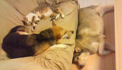 からもらった止血剤のおかげか、今のところものすご~~~~い出血にはなっていません。まぁ。。。今日が3日目なので油断できませんが 下腹部痛はかなりおさまっています。私の体調よりも、今気になるのは、ニズモちゃん この2日くらい、吐いちゃってるんですよね。 多分、食べすぎ。 昨日なんて畳に敷布団とトゥルースリーパーの一部にも。。。 洗えるものは洗濯中ですけど、敷布団はともかくトゥルースリーパーは洗えない。なので、一生懸命、ぬれたタオルで拭いて、今風通しのよいところで乾燥中です。もともと引っ越してきた時に、旦那の提案で「ニズモが階段を登ってこれないから(太りすぎて)、慣れるまで1階で布団を敷いて一緒にいてあげよう。」だったんですけど、このところ続いているチビたちの不祥事に堪忍袋の緒がきれたらしく。。。「今日から2階の寝室で眠る」と旦那。布団ではぐっすり眠れない、っていうのもあったようで。。。昨日は初めて寝室のドアを閉めてたちと別に夜を過ごしました。 私はさびしいビスケット君、小さい時から私と旦那の間でブランケットにくるまれて眠るのが好きだったから、すっごくかわいそうで気になったんですけど。。。しばらくドアのそとで物音がしていましたが、朝には1階のソファで眠っていたみたいです。慣れてくれるかな。 ニズモちゃん、食事を減らして様子をみていますが、今日は大丈夫みたい。ビスケット君のご飯まで食べちゃうから、彼女が登れない階段の踊り場においてみてます。 はぁ。 なかなか大変ですなぁ、たちって。