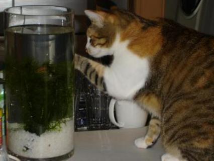 昨日、旦那が買ってきたお魚 ”ヒル(昼)”君。元気にすいすい泳いでますが。。。。。。。密かに私と旦那が恐れているのは、このの反応 ↓ 狙ってます。 狙ってます賢いヒルくんは、いつもは上の方を泳いでいますが、(シナモンちゃん)が近づくと、さささ~~~っと下の方にかくれます。意外と重いガラスの花瓶なので、そうそう簡単には倒れないし。でも彼女は恐ろしいハンター。 どうか、どうか。。。頑張って逃げ延びてほしいものです 彼女が諦めるその日まで。