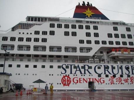 今日は、むか~し昔。。。おそらく14~5年前からの友達で、11年は確実に会ってなかったマレーシア人のスーちゃんが、来沖するとのことで、港へ会いに。なぜ、港か?彼女はStar Cruisesという豪華()客船のスタッフなんです私、以前そういう仕事をしていたので、その時に知り合ったんですよねぇ。 今回の船は『Superstar Aquarius』 5万1千トンくらい。 乗務員だけでも1000名以上という。 この船は、台湾~石垣~那覇をクルーズしていて、毎週火曜日が那覇に着くんです。 沖縄はあいにくので、大失敗したのが。。 約束の時間。 スーちゃんが「じゃ、11:30頃にね」とで言っていたので、11:00には着いて連絡したら、「え もう着いたの 10:00よ、今。 11:30って言ったのに」 はい。 その仕事を離れて11年。 すっかり忘れてました。船内の時計は台湾時間(日本より1時間遅い)に設定されているんですね。 彼女の仕事が終るまで、まだ時間があまってたので、船の中に(なかば無理やり)入れてもらいました。 ↑ こんなパスをもらって。 本当は外国船なので事前に書類を送っておかないといけないのだけど。この日は年に1度の「従業員表彰式」がある日。 あはは 私も従業員にまぎれて後ろの席でみせてもらっちゃった。表彰の合間にセクシーなダンスショーや、マジックもやってたな。 写真はダメらしかったのでとれなかったけど。。。これからしばらくは毎週沖縄にやってくるようなので、今度はちゃんと時間をあわせてスーちゃんをショッピングに連れていってあげよう。 ** 朝の9:00頃ついて、その日の16:00には出航しちゃうのよね**正直、この船を担当して仕事をしていた時は、ちょびっとこの船のことが嫌いになっていたけど。。大切な友達もできたことだし。 今思えばよい経験だったなぁ~~ アクエリアスちゃん、まったねぇ~~