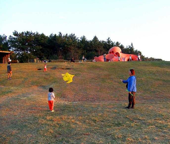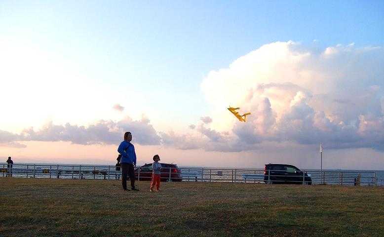 暖かい夕日を浴びながら凧あげ 家族連れも夕日の恩恵を・・・