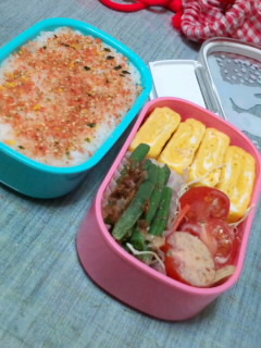 おかずは“玉子焼き、いんげんの和え物、トマトサラダ”
