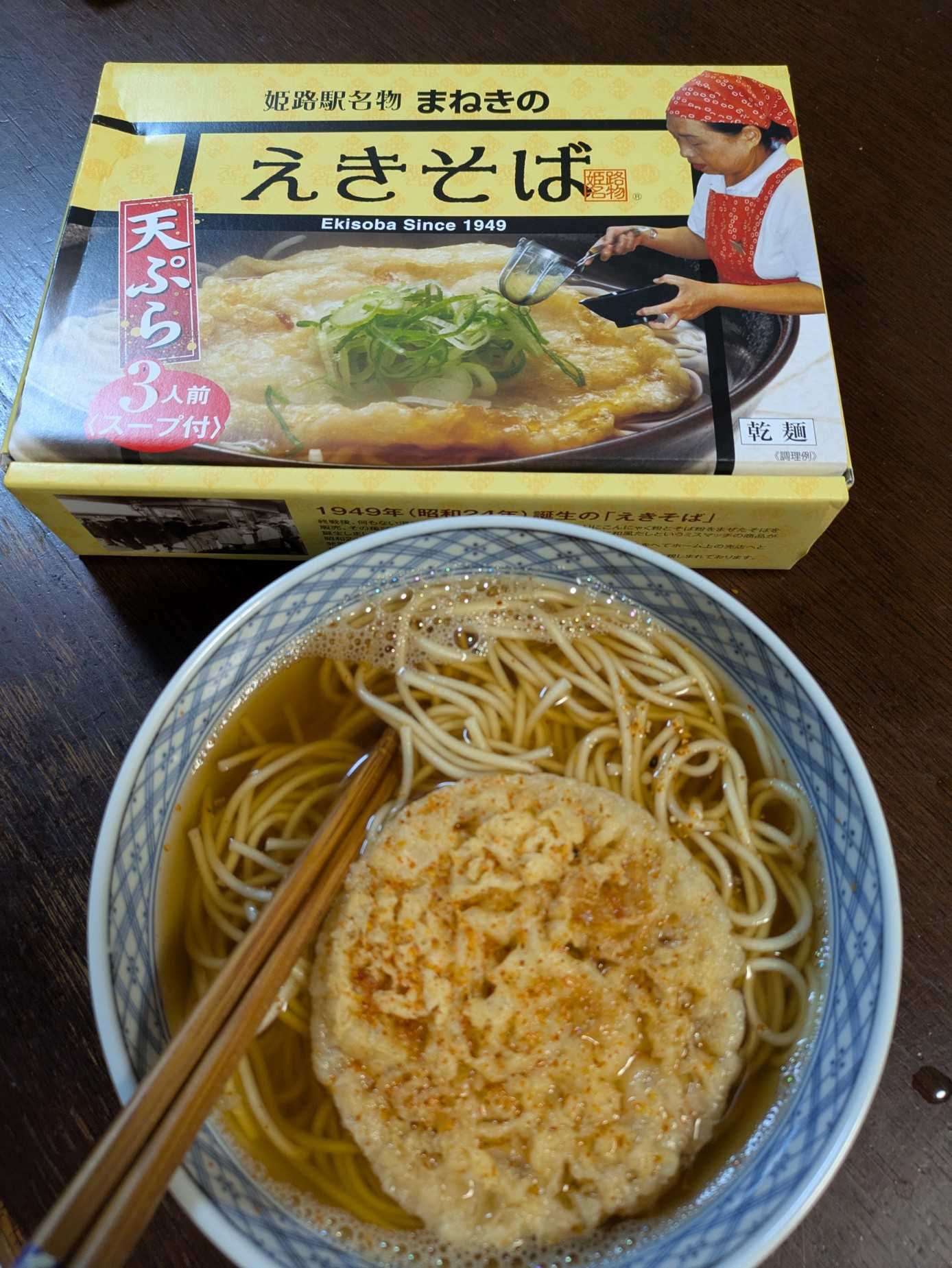 嫁が出張土産として、姫路駅の"えきそば"を買ってきました。家庭でも"えきそば"が楽しめるのですね。ということで、早速作って見ました。うん、スープがちょっと濃いめになったのが残念でしたが、天ぷらの溶け方が良い。美味しいです。