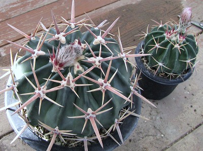 ☆北米原産の強刺類で扁平に育つ1属1種の美花種Homalocephala texensis ホマロケファラ属テクセンシス和名は「綾波」☆春のめざめは早い部類。水を吸ってプックリして新刺と蕾が出てきたすでに小さい苗は開花している・・・・・・・・・・・・・・。 拡大画像 拡大画像☆上の右側の株3号鉢植え ☆接ぎ木の綾波10cm足らずで開花している 袖ヶ浦に接ぎ木の株☆王綾波の実生株12~13cmの大きさ、刺が短く小さくなってきた。 植替えが必要ですが綾波は成長期間が(3月~6月)と短いので早春に植替えが理想なんですが、・・・・・・・・・・・・来春に植え替えるか。 拡大画像 ☆この株も12・3cm見ごろの株、強刺の「剣峰」に近いタイプです。これ以上大きくなるとこじれ易いので、来春の植替えは必須です。☆径15cm程の株。我が家の1番の大株ですが、中段にこじれの跡がついている-----------------この花何の花昨日の答と今日問題右の花はなんでしょう。 拡大画像 ・☆ディスコカクタス ホルステー ☆多肉植物?(球根植物)デスコの最小種です この株斑入り種なんですけど------------------------ ブログランキングに参加しています------------------------フォト蔵に画像登録していますhttp://photozou.jp/photo/top/308634
