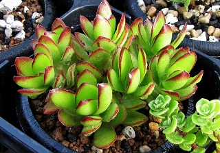 14日は最高温度30℃を超え暑さに弱いエケベリア達は日中多少グッタリの様子エケハウスの開口部を広げ通風を図った。夜間が涼しくなるので回復するでしょう。こんな時期の葉挿しした中型エケベリアの様子は・・・エケベリア・桃太郎(Echeveria 'MOMOTAROU' )=チワワリンゼ(リンゼアナ×チワワエンシス)赤いポッチの両種の交配、リンゼアナの因子で大型に・・雑種は丈夫で育て易い優良交配種。桃太郎の葉挿し苗上の苗の下葉を今年春、もぎ取って出た仔を独り立ちさせた。桃太郎の葉挿し第2弾 味を占め再度実施した。親苗は植替えでノーリスクで行える。別苗からもぎ取った葉から稚苗が出来ている。グラプトベリア・オパリナアメチスチヌム×コロラータ(リゼアナ)の説もある。すると、「桃太郎」の異母兄弟に成るが・・・見栄えのある良種。おまけに、グラプト系は葉挿し容易。エケベリア・ラウリンゼ(Echeveria‘Laulindsa')=(E.lauii×E.lindsayana)これもリンゼアナが親なので「桃太郎」や「オパリナ」と同じ異母(父)兄弟に。エケベリア・招福錦(花いかだ錦)(左)パキフィツム・ビリデ(Pachyphytum viride)(右)左は花茎に付く葉で葉挿し可能、斑入りの葉で斑入りが出る。右のビリデはパキフィツム属なので葉挿し簡単。エケベリア・パープルプリンセス(Echeveria 'Purple Princess')(左)エケベリア・あずき(シャビアナ×紅司の曲者同士の交配種)(右)この両種は花茎に付く葉が大きいのでこの葉から葉挿しする。同様に行えるのに、「古紫」や先の「花いかだ」などでも行える。 応援には1日1回 ポチ を・・・