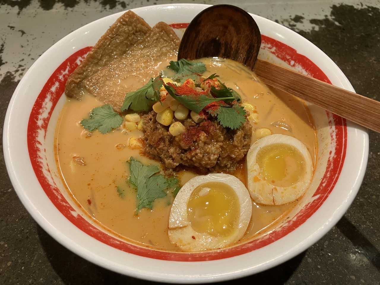 トロントのレストラン巡り、第146回。今年3回目のKinton Ramenだ。前2回は3/30と7/31に。春、夏に続いて、秋も限定メニューを出している。今月までなので早めに食べに行くことにした。https://kintonramen.com/秋の限定は、SwicyラーメンとGolden Sesamiラーメンの2つ。目当ては前者、Swicyラーメンを食べに来た。また、$4追加で餃子4個とソフトドリンクを付けられる。ちょうどコーラを飲みたい欲を感じていたので、ここで満たしていこう。名前の通り、甘くて辛いラーメンだ。豚骨ベースの甘辛スープと、太麺の相性がいい。ストレートさと奥深さの両方を感じる味だ。そして、中央には唐辛子のかかった挽肉。これが辛味の大部分を担う。やはり食べ進めるうちに辛味がスープに移っていくという仕掛けだ。他にはコリアンダー、コーン、味玉1個、それに油揚げが入っており、これらもいい味を出している。油揚げはトロントのラーメンではあまり見かけない気がする。価格は$23.98、税チップ込みで$31.50とした。これ書いて思ったのは、会計を受け取るのが日本人だとわかっている状況ならば小数点以下を.39にしてみようかって思いついた。チップはいつも自力で計算している。機械に任せると、税込み額を基準に計算されるため高くなりやすい。前述の通り、Kinton Ramenは3度目の来店になる。春、夏、秋の限定メニューを食べてきた。冬も食べに行くかはメニューを見てから考えるが、それとは別に定番のラーメンも食べたい。来月になったらまた情報を仕入れて、食べに行く計画を立てよう。