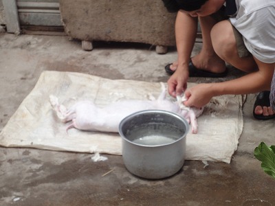 中国では最近の若い世代になってからは、西洋の影響なのか、裕福になりいやなことは避けるようになったのかは不明ですが、自宅でにわとりをさばいたり、魚を裁くことも少なくなってきたようです。 今でも大きな市場へ行けばまだ、生きた鶏を売っていますが、生きたまま買って帰る人は非常に少なくなりました。 まあ、マンション住まいの場合鶏を絞めて捌く場所も有りませんし、周囲が汚れるのでできなくなったからかもしれません。 田舎では今でも家で鶏を飼い、自宅で処理して食べています。 これらは過去家に冷蔵庫が無い時代からの方法で、生肉は保存ができないため、干し肉や燻製に保存してきました。 それ以外はその場で調理すれば新鮮そのものだからですね。 都市部でも農民工が多く住むエリアでは今でも時々見かけます。 先日買出しに行ったときに道路わきで何か白いものを水で洗っていたので除いてみたら、鶏ではなくウサギでした。 中国ではウサギも食べます。 以前、マンションの友人が自宅の庭でウサギを飼っていました。子供がいるので子供のペットに買ったのかと思いきや、あるとき、おすそ分けとしておかずをいただいたのですが、後から聞いたら庭にいたウサギが大きくなったので食べたとの事。 さすがに飼い犬までは食べないようですが、ウサギさんかわいそうですね。 家の中では出来ないようで、道端で作業していました。