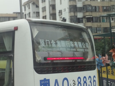 自動車には製造メーカーの名称またはロゴマークが必ず付いていますが、中国も同様にエンブレムが付いています。 但し、中国では名称に英字のみはご法度で必ず漢字での記載が義務付けられています。しかも、旧字体などは使用できませんから名称によってはちょっとセンスが無いように見えますね。 ホンダは漢字も同じ本田ですし、日産も同じですが、トヨタは豊が三に縦1の組み合わせで串刺しのようになってしまいます。 車名も英文の読み方を漢字に変換しますが、当然発音そのものですと見栄えや意味が良くない場合は多少発音が異なっても、良い漢字の組み合わせにしますから英字読みと全く異なってしまうことも多々あります。 豊田ではカムリが良く売れていますが漢字は凱美瑞になります。 本田のFITは飛度ですね。 乗用車は圧倒的に外資系が売れていて純国産車はチェリー,BYDなど多少は見かけますが、主流ではありません。 特に会社などの社員が乗る車は9割が外資系です。 何故高い外資系を買うのかというと、一番はカテイで最初に買う高額な買い物である為故障が少なく、信頼の置ける外資系を買うのとやはり面子が重要と思いますね。 排気量も最低1600ccを買うようですし日本のように1000ccから1300ccのコンパクトカーはあまり買わないようで、奥さんなど二台目買うようです。 バス、トラックは外資系は少なくベンツ、ボルボ、日野、現代などもありますが国産が有利ですね。 一番多いのが金龍ブランドで圧倒的なシェアです。 ここで面白いのがこのバスの後部ガラスに会社の名称を表示していることでしょうか。 それもロゴなどではなく漢字で正式な社名が書かれています。 ちょっと日本では見かけない広告ですね。